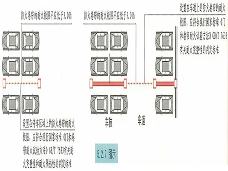 當防火卷簾的耐火極限僅符合現(xiàn)行國家標準《門和卷簾的耐火試驗方法》GB/T 7633有關耐火完整性的判定條件時,應設置自動噴水滅火系統(tǒng)保護。自動噴水滅火系統(tǒng)的設計應符合現(xiàn)行國家標準《自動噴水滅火系統(tǒng)設計規(guī)范》GB 50084的規(guī)定,但火災延續(xù)時間不應小于該防火卷簾的耐火極限。汽車庫、修車庫、停車場設計防火規(guī)范 GB50067-2014 5.2.7 設置在車道上的防火卷簾的耐火極限,應符合現(xiàn)行國家標準《門和卷簾的耐火試驗方法》GB/T 7633有關耐火完整性的判定標準;設置在停車區(qū)域上的防火卷簾的耐火極限,應符合現(xiàn)行國家標準《門和卷簾的耐火試驗方法》GB/T 7633有關耐火完整性和耐火隔熱性的判定標準。