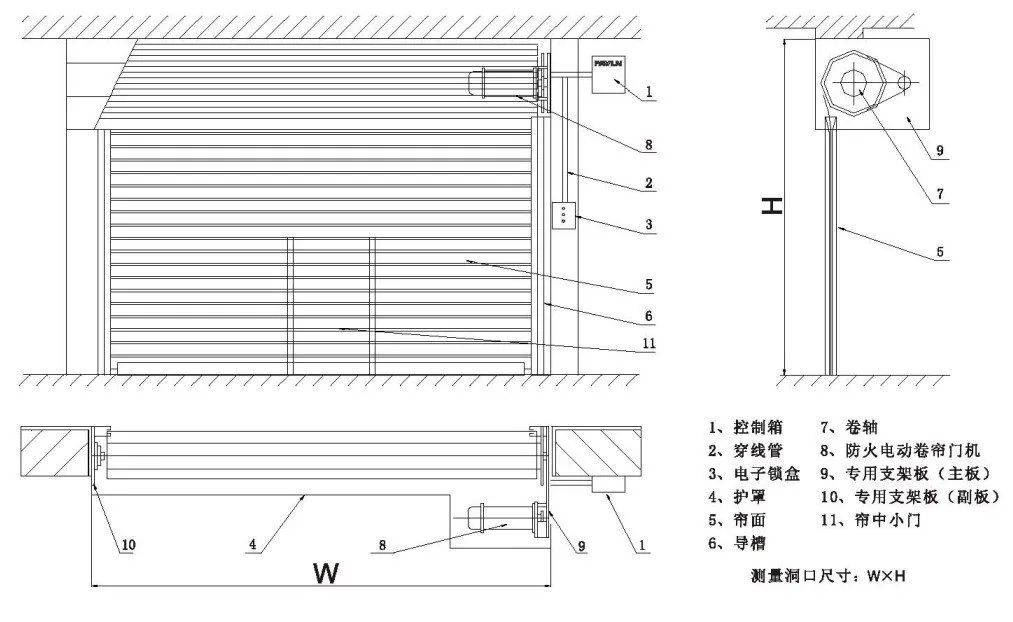防火卷簾由簾面、導(dǎo)軌、座板、門楣、箱體并配以卷門機和控制箱等結(jié)構(gòu)組成,