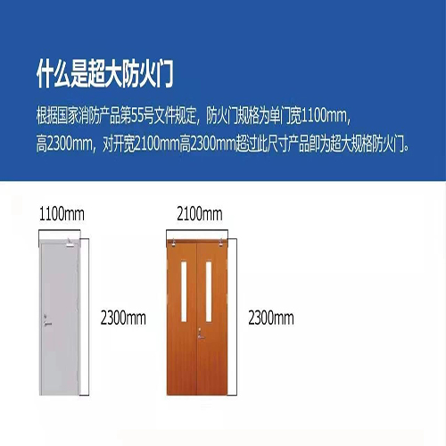 超大尺寸防火門是根據(jù)消防產(chǎn)品55號文件規(guī)定:防火門單門寬1100mm,高度2300mm;對開寬2100mm,高度2300mm。超過此尺寸產(chǎn)品,稱為超大尺寸防火門。