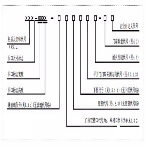 防火門(mén)標(biāo)記示例1:GFM-0924-bslk5A1.50(甲級(jí))-1。表示隔熱(A類(lèi))鋼質(zhì)防火門(mén),其洞口寬度為900mm,洞口高度為2400mm,門(mén)扇鑲玻璃、門(mén)框雙槽口、帶亮窗、有下框,門(mén)扇順時(shí)針?lè)较蜿P(guān)閉,耐火完整性和耐火隔熱性的時(shí)間均不小于1.50h的甲級(jí)單扇防火門(mén)。防火門(mén)標(biāo)記示例2:MFM-1221-d6B1.00-2。表示部分隔熱(B類(lèi))木質(zhì)防火門(mén),其洞口寬度為1200mm,洞口高度為2100mm,門(mén)扇無(wú)玻璃、門(mén)框單槽口、無(wú)亮窗、無(wú)下框門(mén)扇逆時(shí)針?lè)较蜿P(guān)閉,其耐火完整性的時(shí)間不小于1.00h、耐火隔熱性的時(shí)間不小于0.50h的雙扇防火門(mén)。