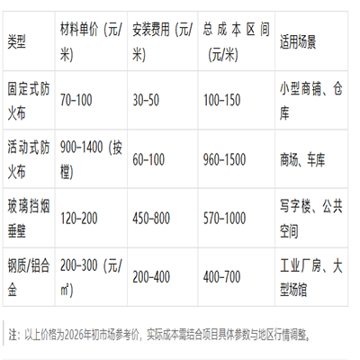 根據市場調研數據,擋煙垂壁的安裝費用通常在 80元至800元/米 之間,部分復雜項目甚至更高。該價格受材質、施工環(huán)境、地域差異及工程規(guī)模等多重因素影響,波動較大。需注意的是,擋煙垂壁多以“米”為計價單位(按長度計算),因其下垂高度一般固定(不小于500mm),長度直接決定工程量。