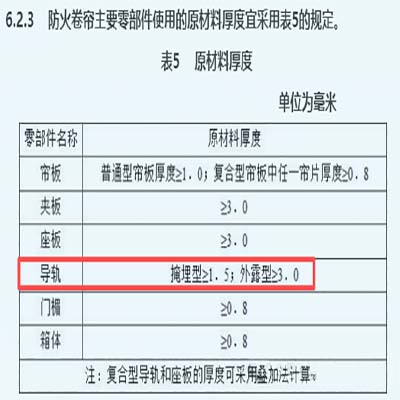 《防火卷簾》GB14102-2005第6.2.3條明確導(dǎo)軌厚度選型?! ?1)不允許導(dǎo)軌的厚度<1.5mm厚,若存在的厚度小于1.5mm的,可直接">