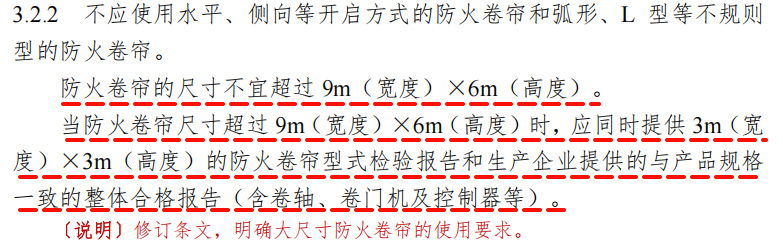 《浙江省消防技術(shù)規(guī)范難點問題操作技術(shù)指南(2025版)》第3.2.2條明確防火卷簾的尺寸不宜超過9m(寬度)X6m(高度)。當防火卷簾尺寸超過9m(寬度)X6m(高度)時,應(yīng)同時提供3m(寬--度)X3m(高度)的防火卷簾型式檢驗報告和生產(chǎn)企業(yè)提供的與產(chǎn)品規(guī)格一致的整體合格報告(含卷軸、卷門機及控制器等)。